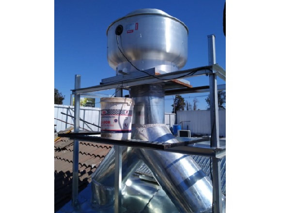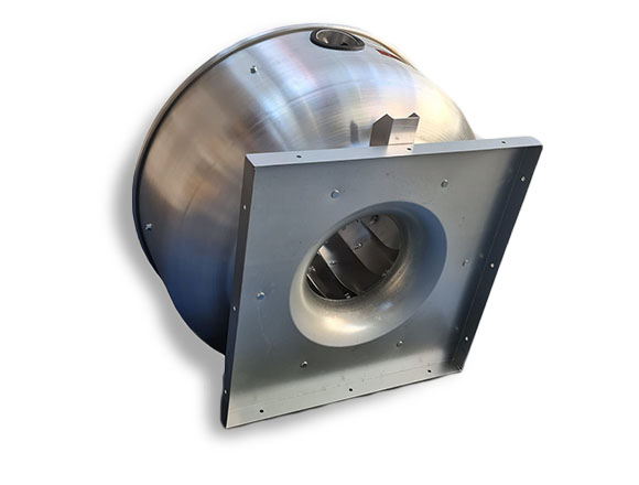 Extractor de aire centrífugo construido en aleación de aluminio. Motor de accionamiento directo. Alabes inclinados hacia atrás balanceados dinámicamente (ISO1940). Motor fuera del flujo de aire, permite aislación de la grasa, partículas y calor de la cocina. El receptáculo exterior actúa como filtro seco recibiendo las partículas de grasa, las cuales son evacuadas por gravedad a una cápsula receptora de acero inoxidable. El flujo de aire es descargado en forma vertical