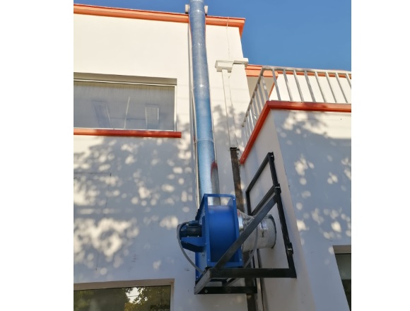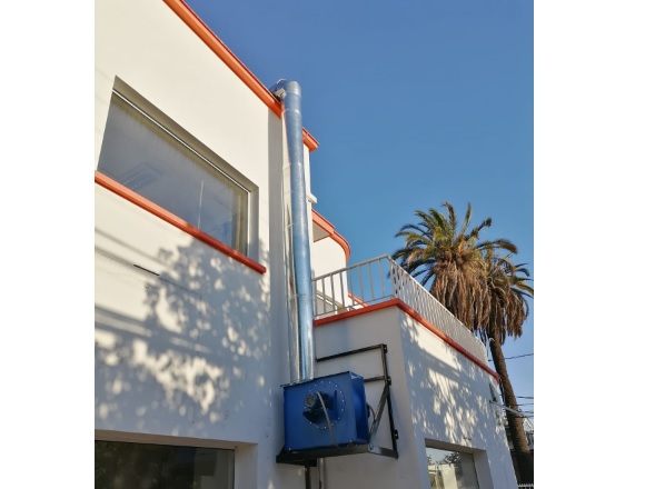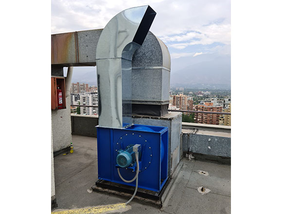270°, lo que permite direccionar la descarga de aire, chapa en acero electro pintada de 4 milímetros de espesor. Álabes inclinados hacia atrás autolimpiantes, montados sobre rodete balanceado dinámicamente, especialmente diseñado para trasegar gases de cocinas industriales conteniendo humo y partículas de grasa. Eje accionado a transmisión directa. Boca de succión en flanche de chapa de acero para atornillar a fuelle y ducto.