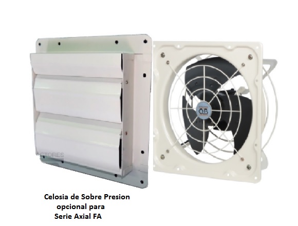 Celosía gravitacional, para ventilador axial mural de serie FA. Cuerpo construido en lámina de acero de 1.5 mm, y aletas en 0.2 mm. Protegido con pintura poliéster anticorrosiva, del mismo color que extractor FA. Ejes de aletas con recubrimiento plástico para funcionamiento silencioso.