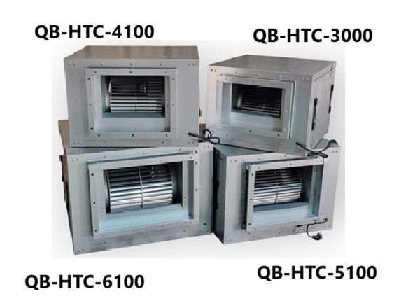 para fácil inspección y limpieza. Internamente la caja está aislada con espuma fonoabsorbente de densidad 18 kg/m3. Las cajas centrífugas de la serie QB-HTC, pueden ser montadas en cielos, techos (exteriores) y muros de forma vertical, horizontal o invertida. Las temperaturas máximas de operación son -20/+50°C. Entre